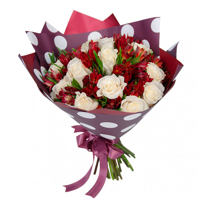 Контрастный букет сочетает нежные белые розы и яркие красные альстромерии. Идеальный подарок для выражения искренних чувств. Букет с доставкой на дом в Тихвине.