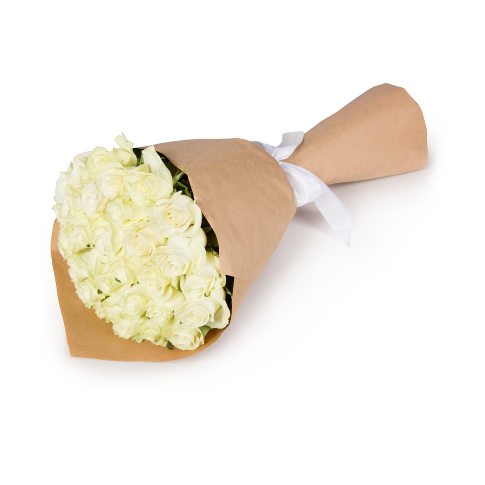 Изысканный букет из 7 белоснежных роз в стильной крафтовой упаковке — воплощение чистоты и совершенства.