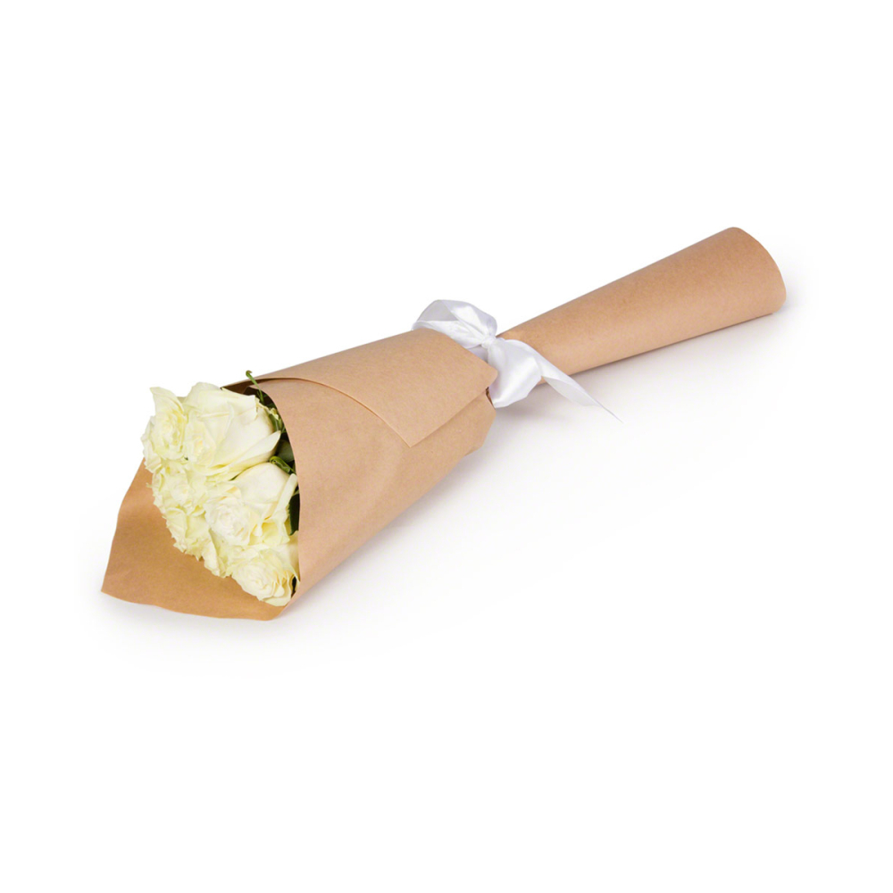 Изысканный букет из 7 белоснежных роз в стильной крафтовой упаковке — воплощение чистоты и совершенства.