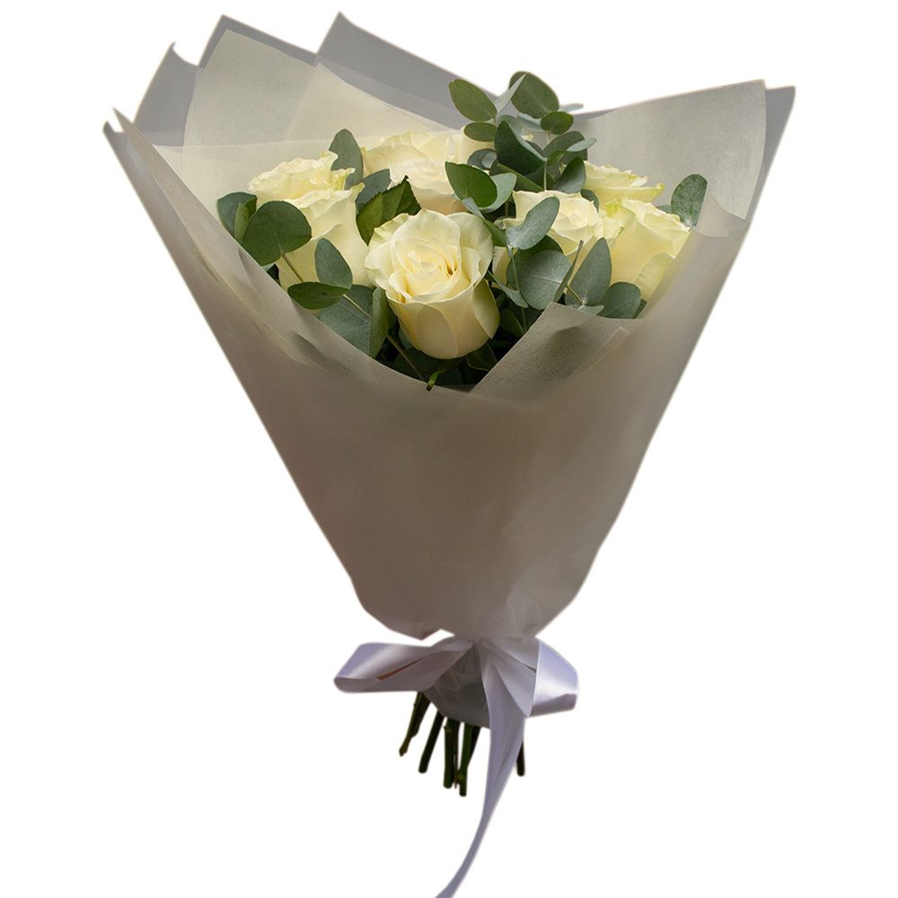 Элегантный букет из 9 белых роз с эвкалиптом – воплощение совершенства