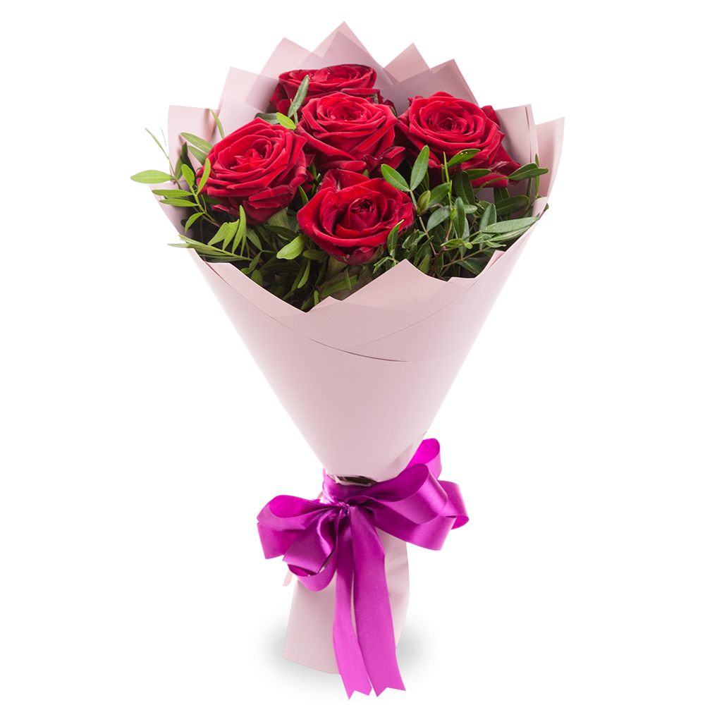 Изысканный букет из 5 красных роз с нежной фисташковой зеленью.