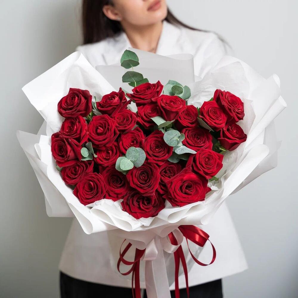 Элегантная композиция из 25 свежих красных роз с серебристыми веточками эвкалипта — воплощение страсти и изысканности. Идеальный выбор для особых моментов и важных признаний. Купить букет роз в Тихвине.