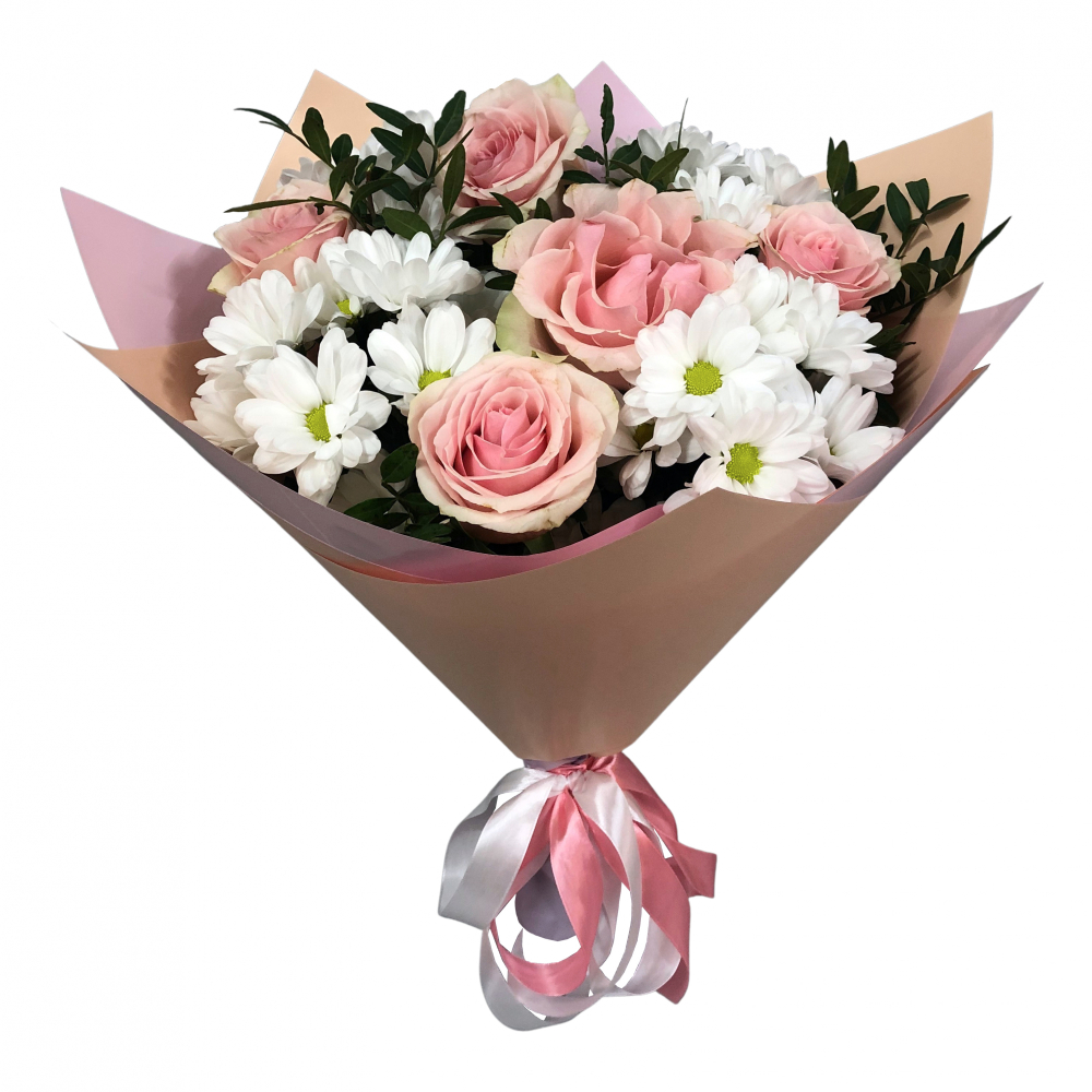 Очаровательный букет сочетает нежно-розовые розы и пышные хризантемы, создавая идеальный баланс между романтикой и практичностью.