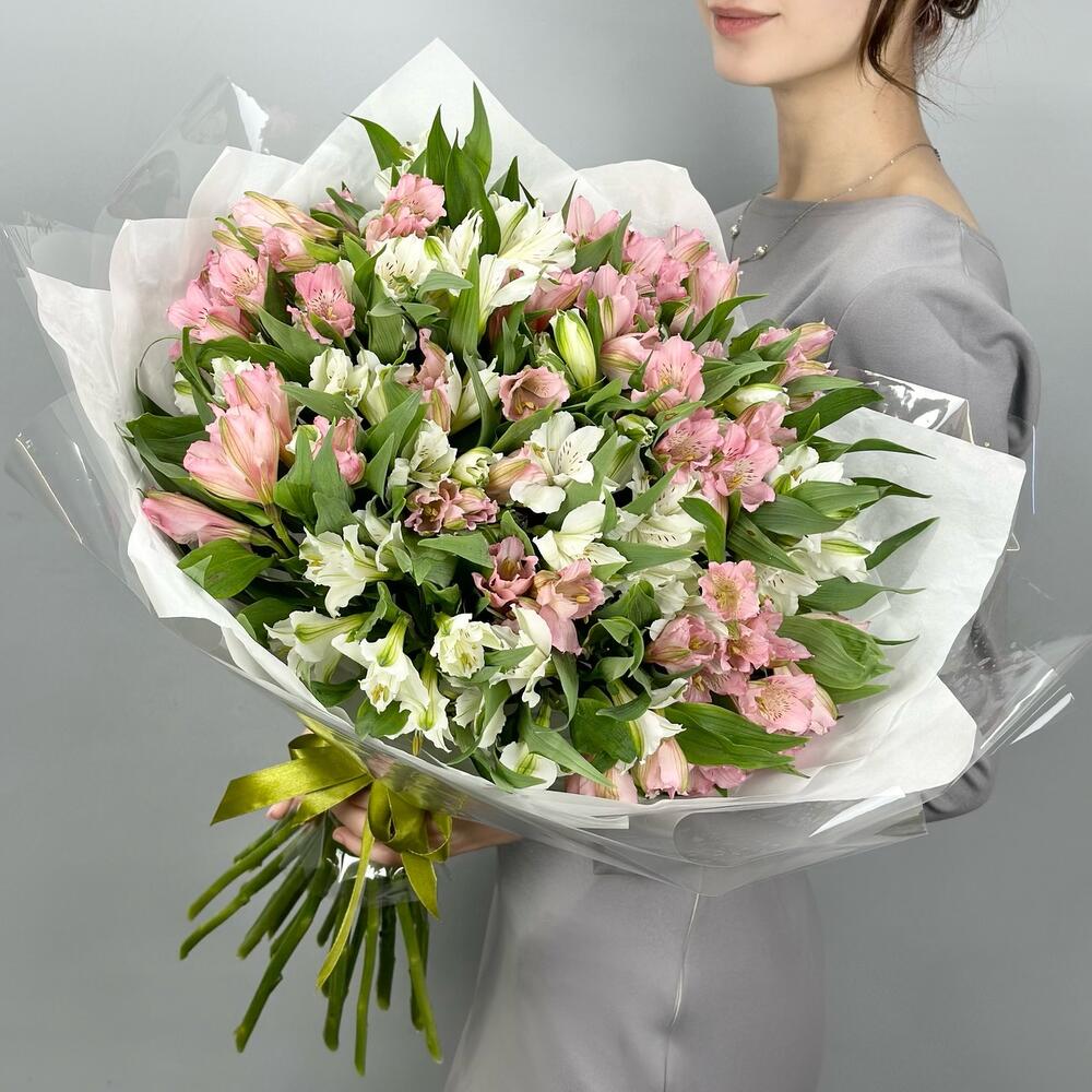 Воздушный букет «Гармония» сочетает белоснежные и нежно-розовые альстромерии, создавая идеальный баланс чистоты и нежности.