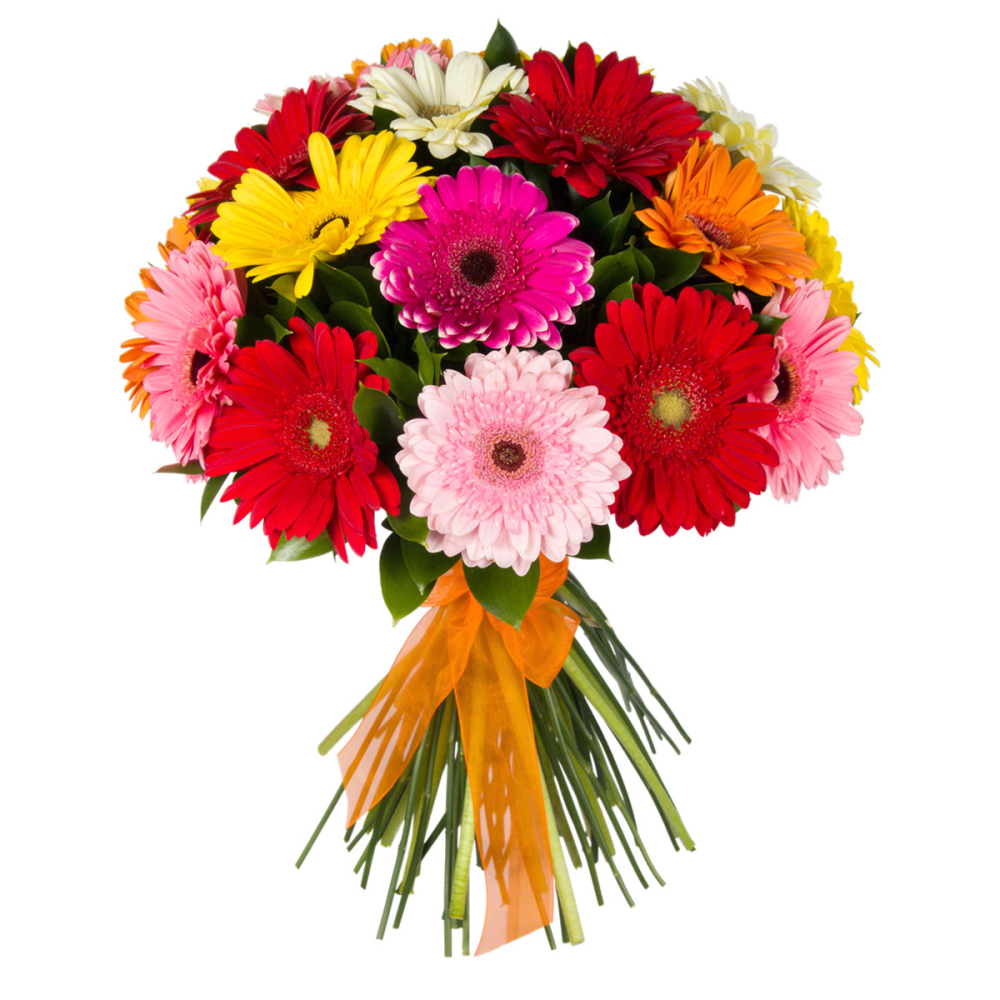 Яркий букет «Мамба» — это смелая комбинация оранжевых, лиловых, желтых и розовых гербер.