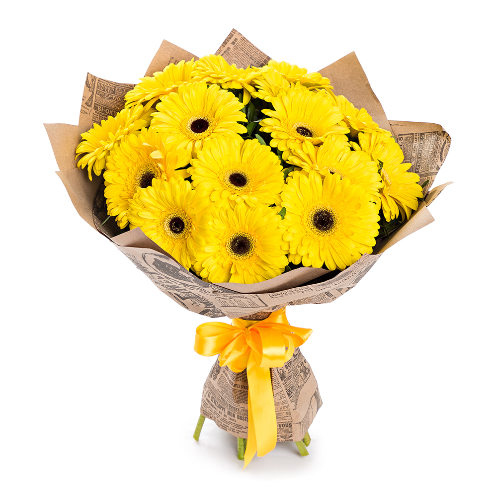 Яркая композиция из 15 свежих жёлтых гербер подарит тепло и радость. Идеальный выбор для подарка жизнерадостному человеку или создания летней атмосферы.