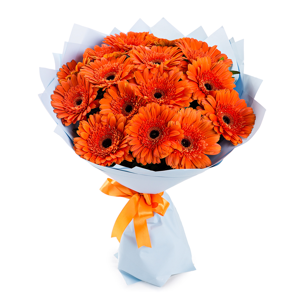 Яркий букет из 15 оранжевых гербер – как кусочек солнца в ваших руках