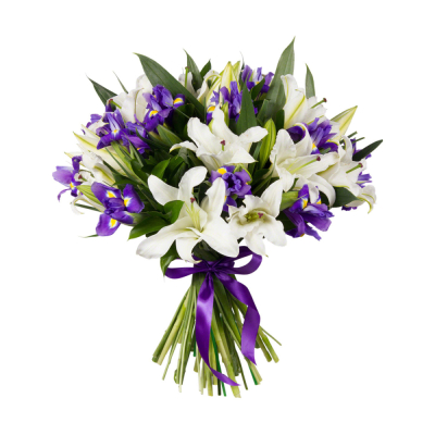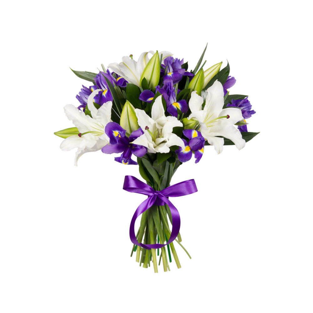 Изысканный букет сочетает благородные белые лилии и небесно-голубые ирисы. Идеальная композиция для романтического жеста или особого признания. Цветы с доставкой на дом в Тихвине .