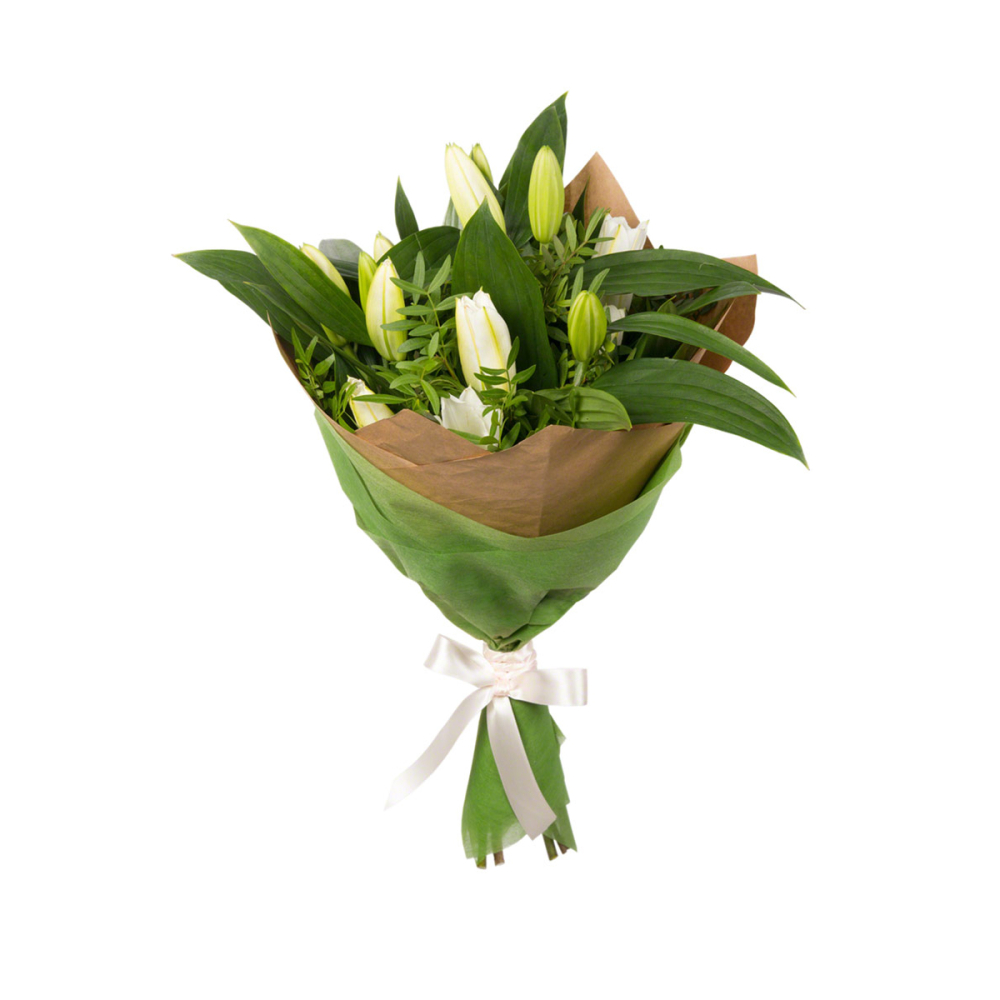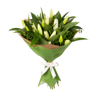 Утонченный букет из белых лилий с нежной фисташковой зеленью — воплощение свежести и изысканности. Идеальный выбор для романтического жеста или знака внимания. Букет цветов с доставкой Тихвин.