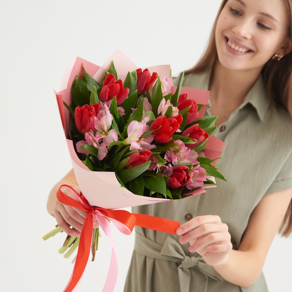 Яркий и очаровательный букет из красных тюльпанов и розовых альстромерий. Этот очаровательный букет станет прекрасным комплиментом на любое торжество!